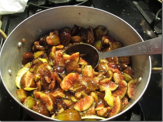 The recipe is simple (you can find it here from last year) and it is worth repeating. I cut the stem ends off the figs, but don’t peel them, as I don’t have nearly enough patience to do that, and it’s generally unnecessary. I quarter the figs because it’s the simples way to cut them. Cut. Turn. Cut.Toss them in a heavy pan with sugar, lemon peel, bourbon and a pinch of salt.